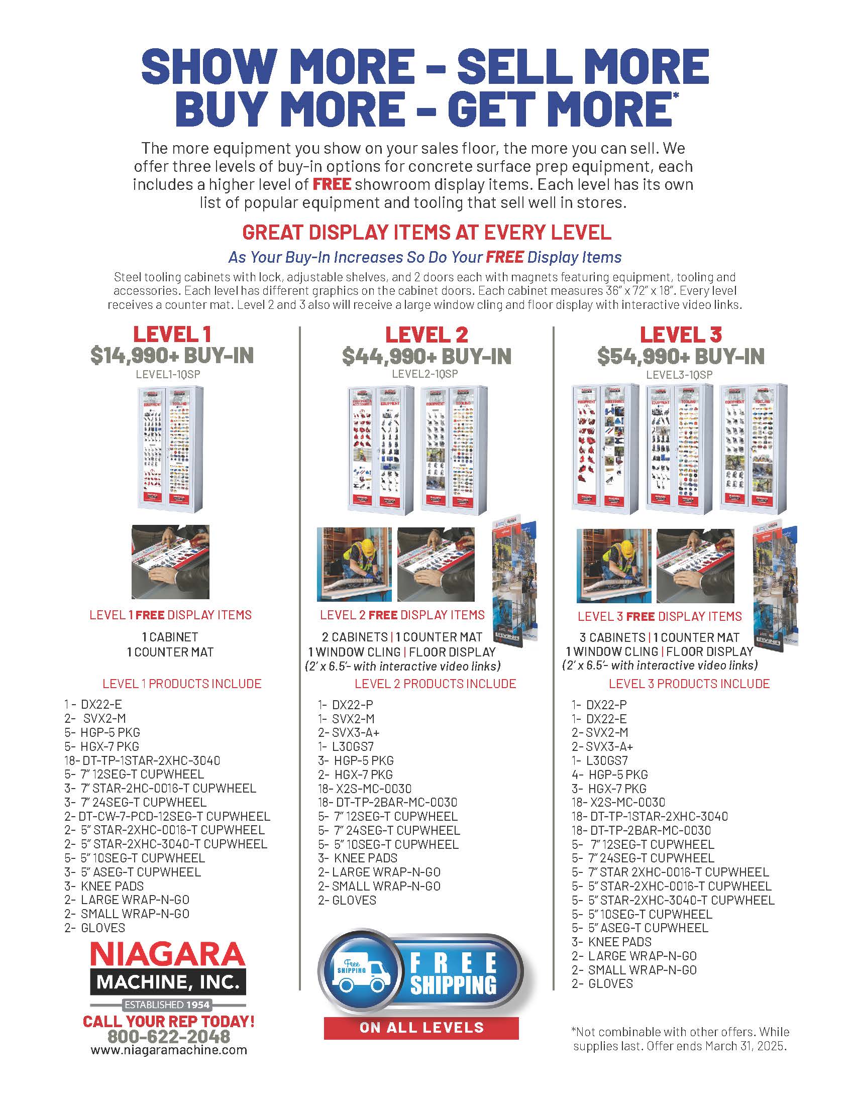 The more equipment you show on your sales floor, the more you can sell. We offer three levels of buy-in options for concrete surface prep equipment, each includes a higher level of FREE showroom display items. Each level has its own list of popular equipment and tooling that sell well in stores.